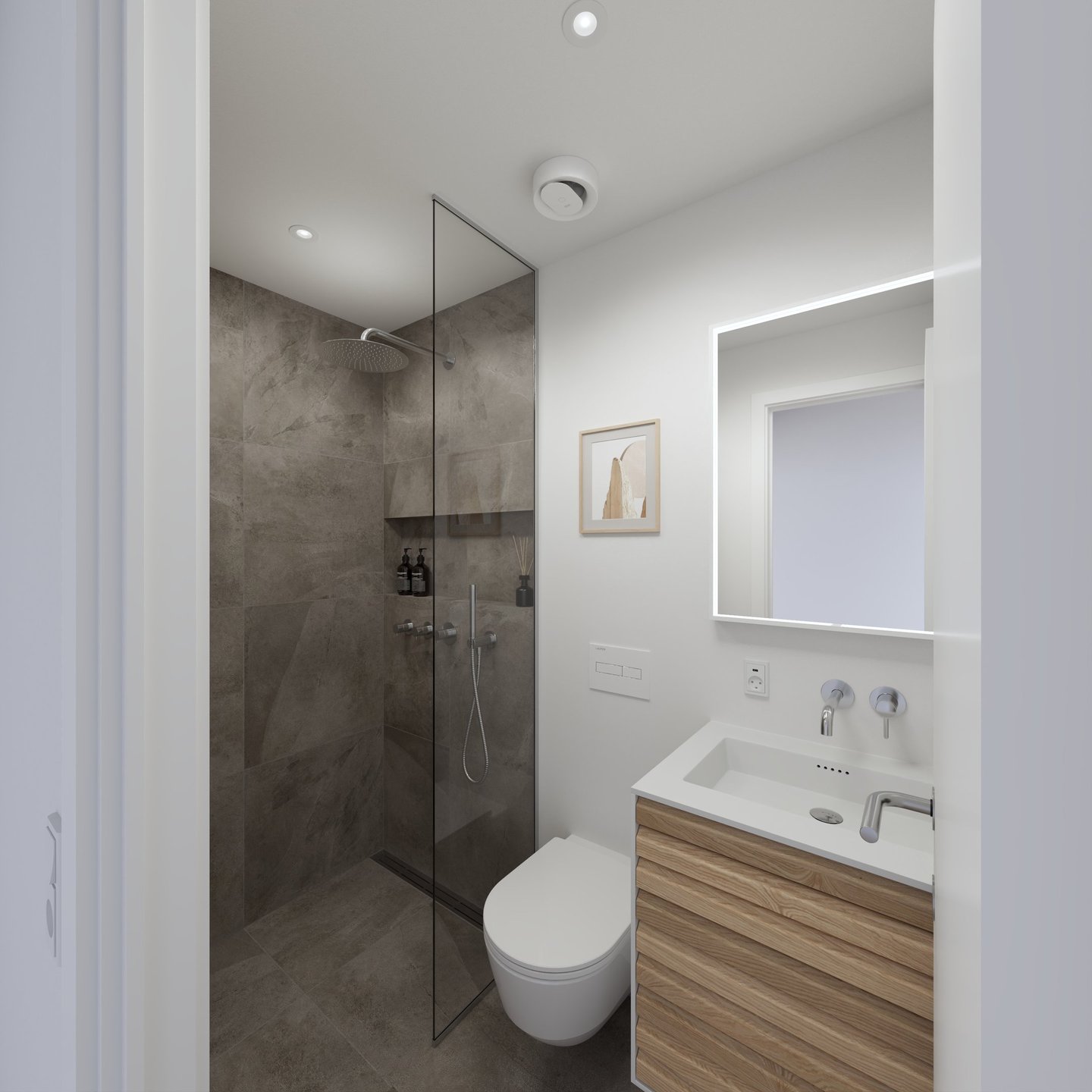 Det 2,2 m² store vådrum er udført med 120x120 fliser i hvide og steninspirerede nuancer samt indrettet med 120 cm vask, væghængt toilet, indbygget opbevaring og glasafskærmet bruseniche.