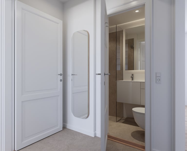Beliggende på 3. sal i en karakterfuld, monolitisk betonejendom i Frederiksstaden, er dette badeværelse resultatet af en gennemgribende renovering, hvor pladsen er optimeret med en større bruseniche, væghængt toilet og integreret vask med elegant opbevaring.