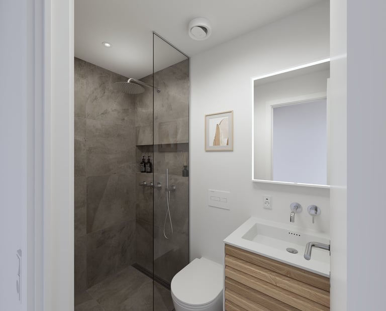 Som et fuldt vådrum er rummet beklædt fra gulv til loft med nøje udvalgte hvide og steninspirerede fliser, der skaber et tidløst og harmonisk udtryk med en rolig, nordisk atmosfære.